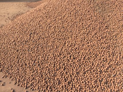 加工好的原材料則可加入制粒工藝流程。當選用塑性指數小于25的粘土時,一般全部都是選用帶孔對輥機成型原料球的。在我國,有些粘土陶粒生產廠家,不注重原材料的加工產品質量,選用塑性指數較大的粘土或孔洞較大的對輥機,使生產出來的陶粒粒徑偏大,呈圓柱形的陶粒多,級配不太好。
